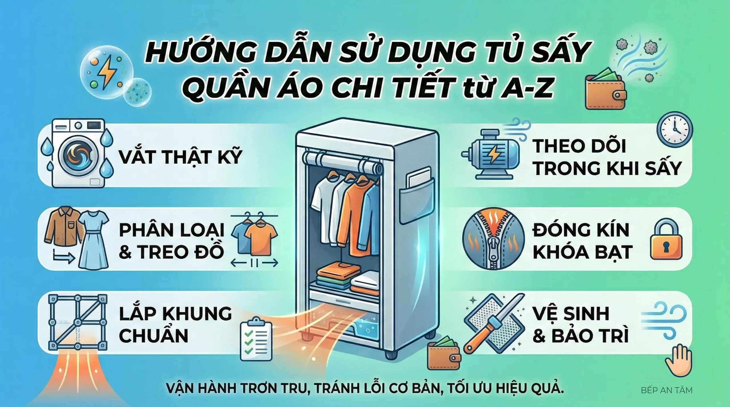Với bản hướng dẫn sử dụng tủ sấy quần áo chi tiết này, bạn chỉ cần ghi nhớ nguyên tắc vàng: A (An toàn điện năng, vắt kiệt nước) – B (Bố trí đồ hợp lý, không quá tải) – C (Cài đặt nhiệt độ và thời gian chuẩn xác) – D (Duy trì vệ sinh định kỳ). Chỉ cần áp dụng đúng 4 điểm này, hiệu suất vận hành của chiếc tủ sấy sẽ luôn mạnh mẽ, bền bỉ và giữ cho quần áo của gia đình bạn luôn khô ráo, thơm tho suốt mùa nồm. Hy vọng cẩm nang hướng dẫn sử dụng tủ sấy quần áo của Bếp An Tâm đã giúp ích cho bạn!